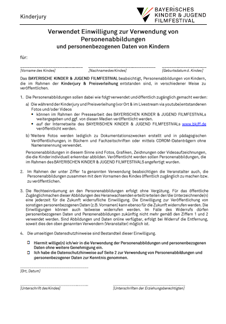 Drei Jurymitglieder kommen aus Schwaben, sie repräsentieren damit Augsburg als Austragungsort. Ellis kommt aus Eichstätt und Benjamin aus Nürnberg. Die Jurykinder sind zwischen zehn und 12 Jahre alt und diese wählen aus allen im Kinderprogramm gezeigten Kinderfilmproduktionen die zwei Bayerischen Kinderfilmpreise in den Alterskategorien bis 8 Jahre und 9 bis 12 Jahre aus.