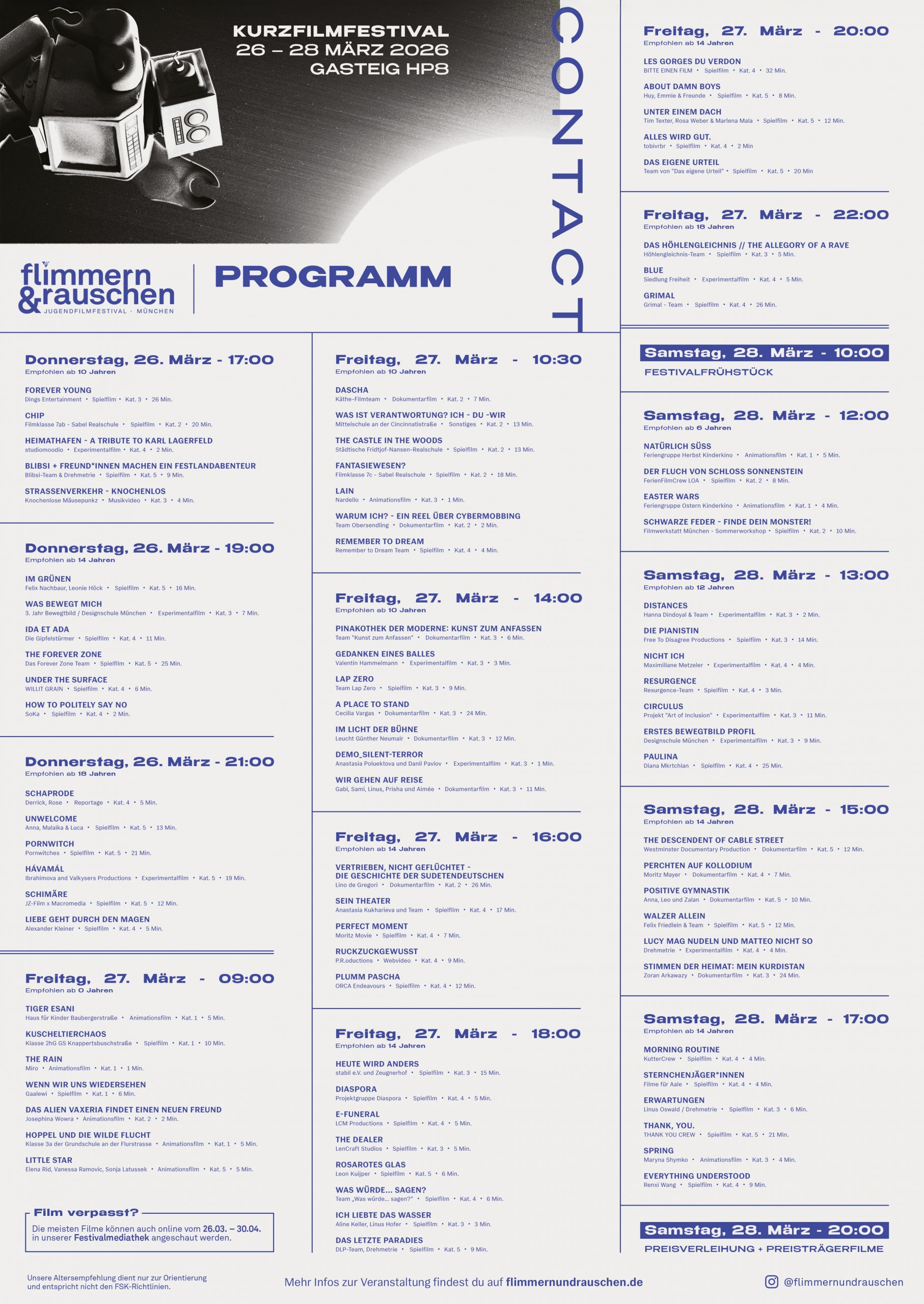 Unter dem Motto „Contact“ lädt das Festival dazu ein, Verbindungen bewusst wahrzunehmen und herzustellen. Gemeint sind Kontakte zu anderen Menschen, zu eigenen Gedanken und Gefühlen sowie zu Fragen und Erfahrungen, die den Alltag prägen. Die Begegnung mit Filmen, Menschen und Perspektiven wird dabei zum Ausgangspunkt für Austausch und Gespräch. „Contact“ versteht sich als offener Impuls an alle Besucher*innen, neugierig zu bleiben, miteinander ins Gespräch zu kommen und Momente zu teilen.
