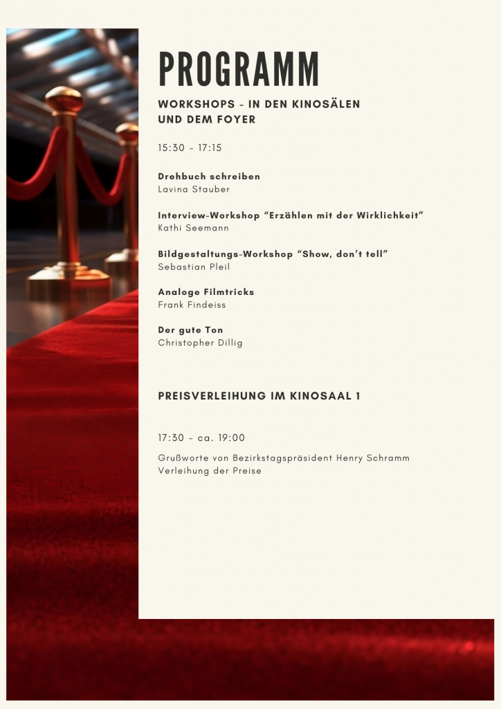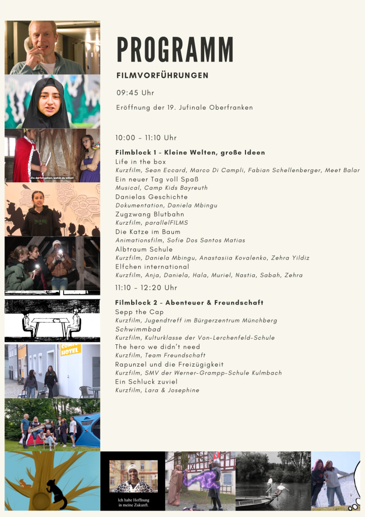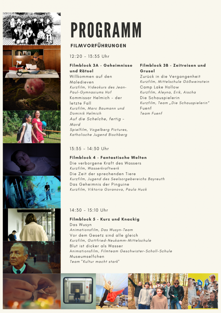 Am 22. November werden die Produktionen der oberfränkischen jungen Filmszene auf großer Kinoleinwand präsentiert. Hier findet ihre das Filmprogramm und den Tagesablauf.